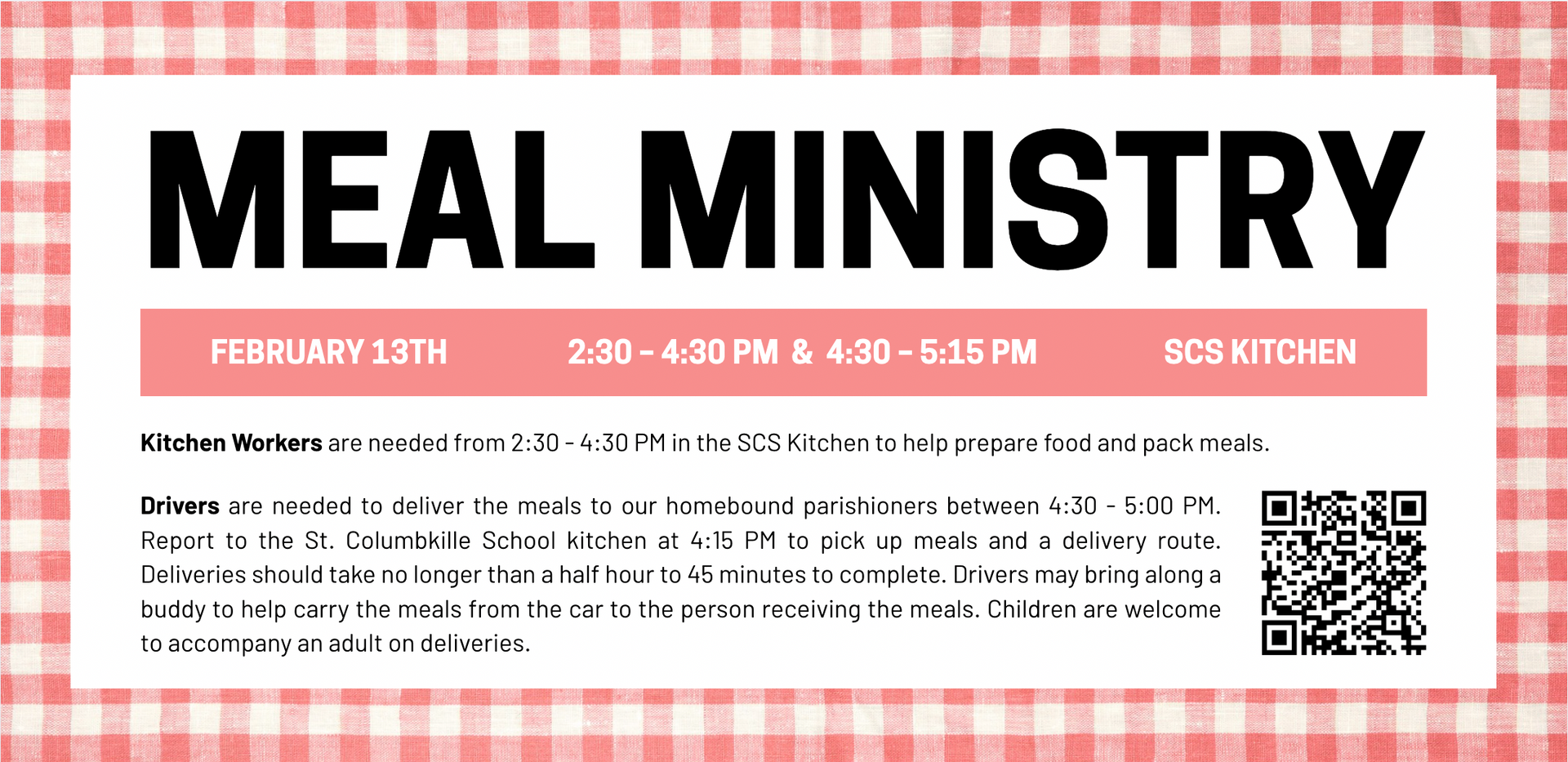 - Bakers. Of course, dessert is included with our meals so help from our parish bakers is a must! Make the dessert (listed on the SignUp Genius) in your own home and drop-off at the St. Columbkille rectory office on select Fridays between 8:30 a.m. and 1:00 p.m. A limited number of desserts are needed for each Meal Ministry delivery day. Please check the SignUp Genius for the specific dessert needed.